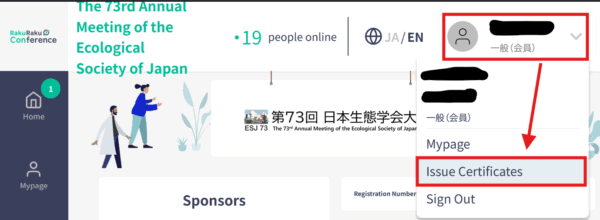 - Please download and print your name badge from the conference platform Rakuraku-Conference in advance. You can download from “Issue Certificates” page on Rakuraku-Conference. Participants who have brought their name badges do not need to check in at the registration desk.