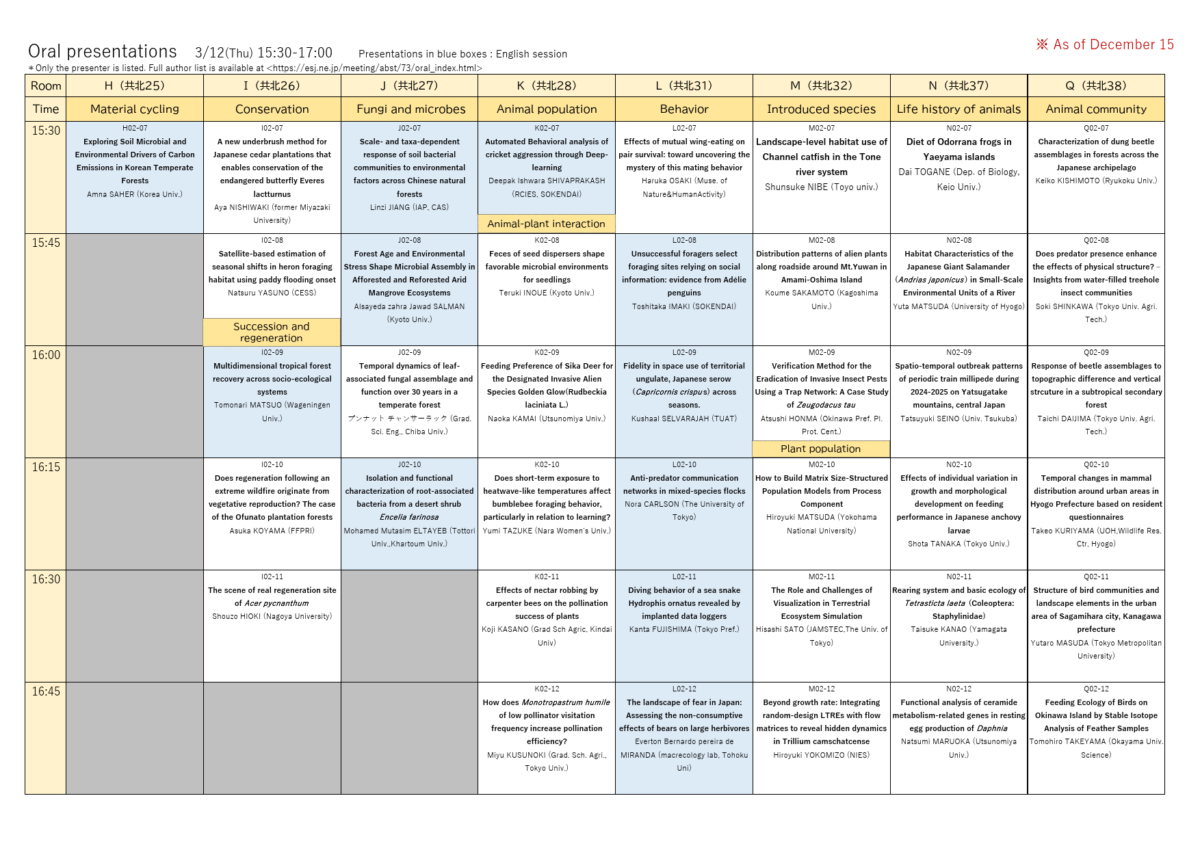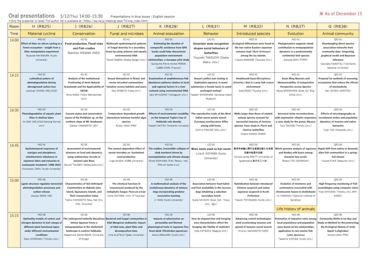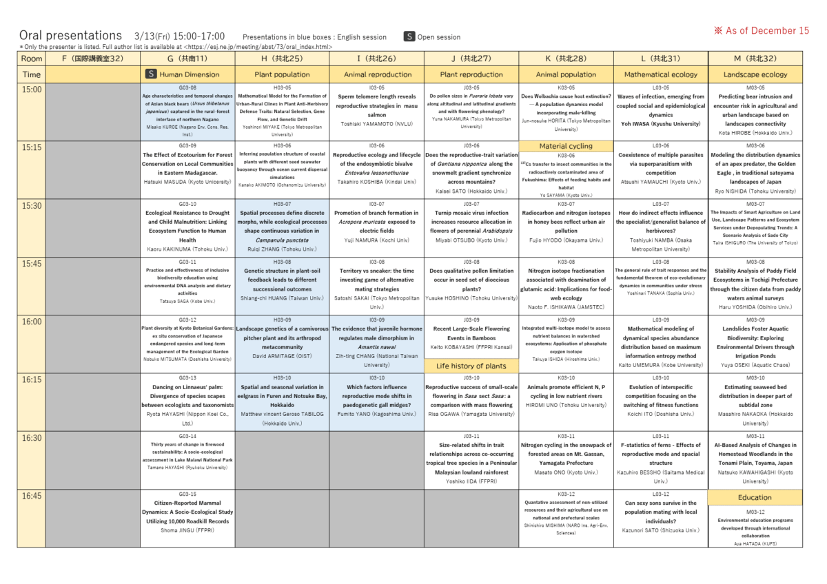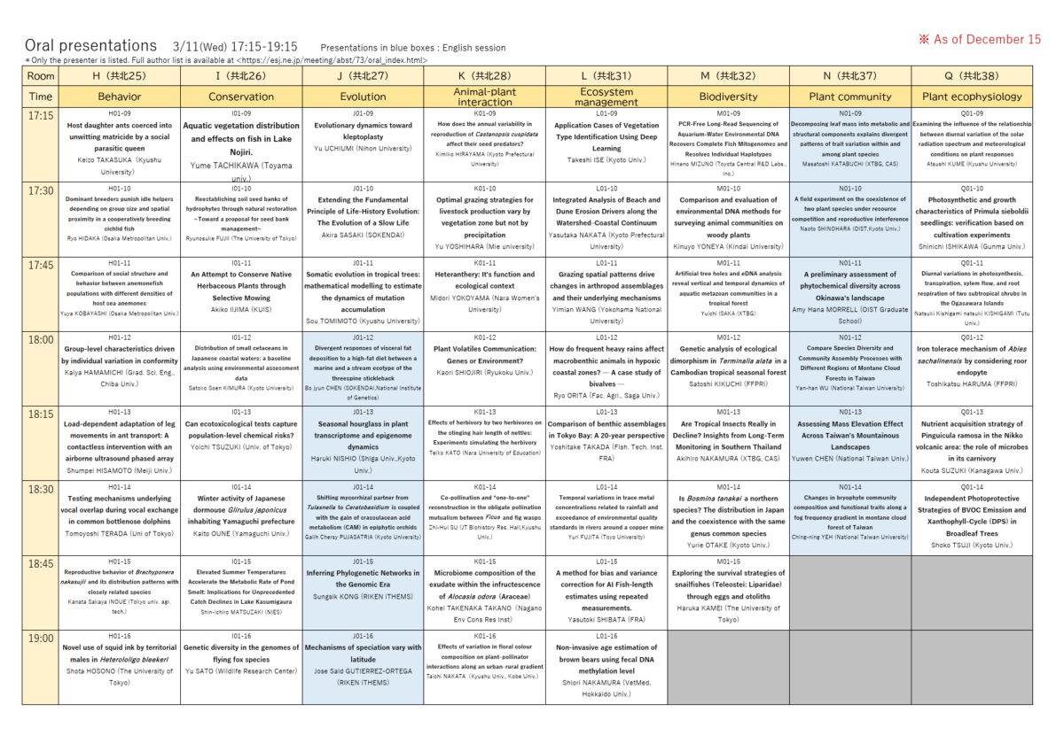- The program is now available from the Ecological Society of Japan’s Conference Abstract Viewing Page. The abstract of each presentation is now under preparation.